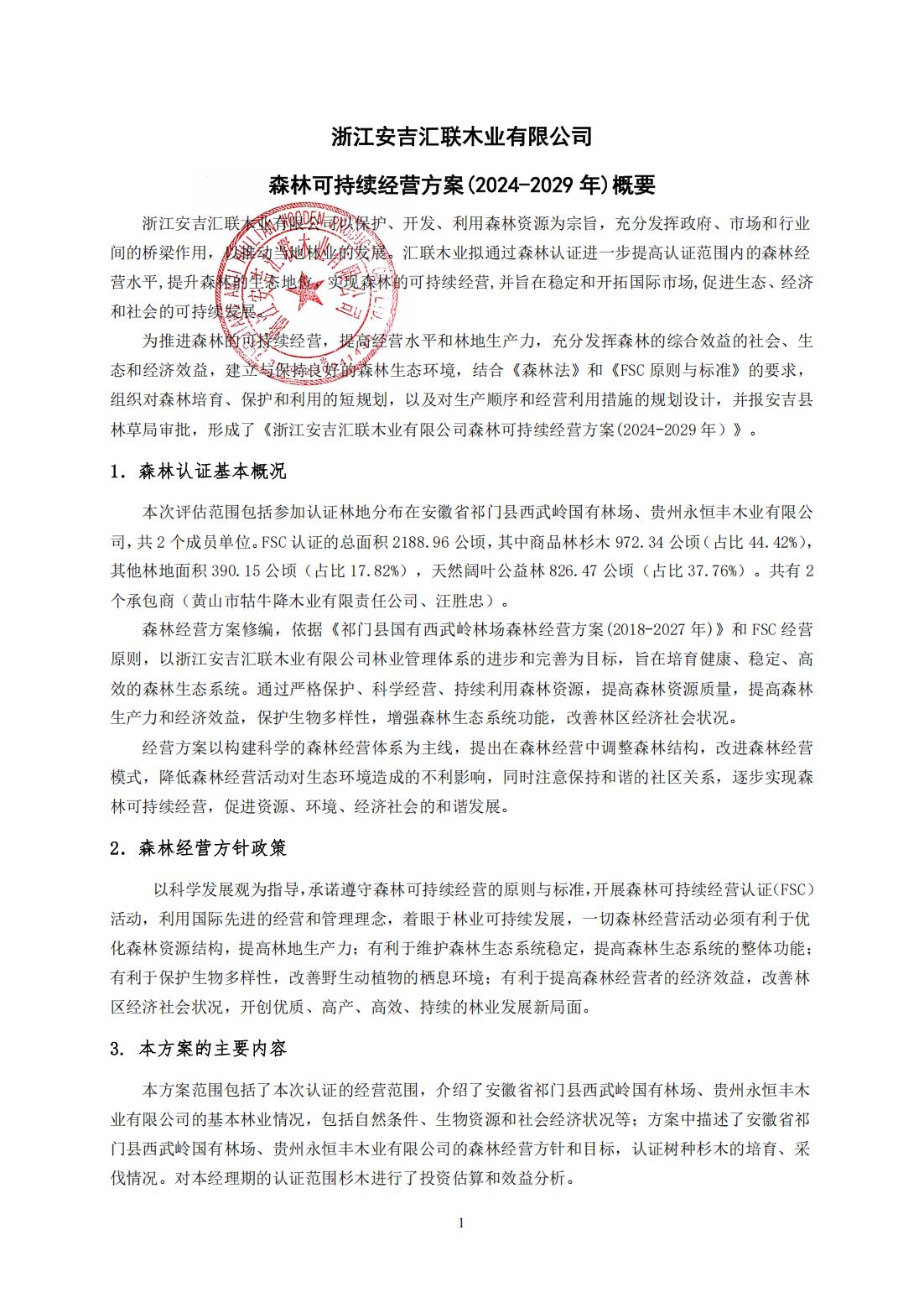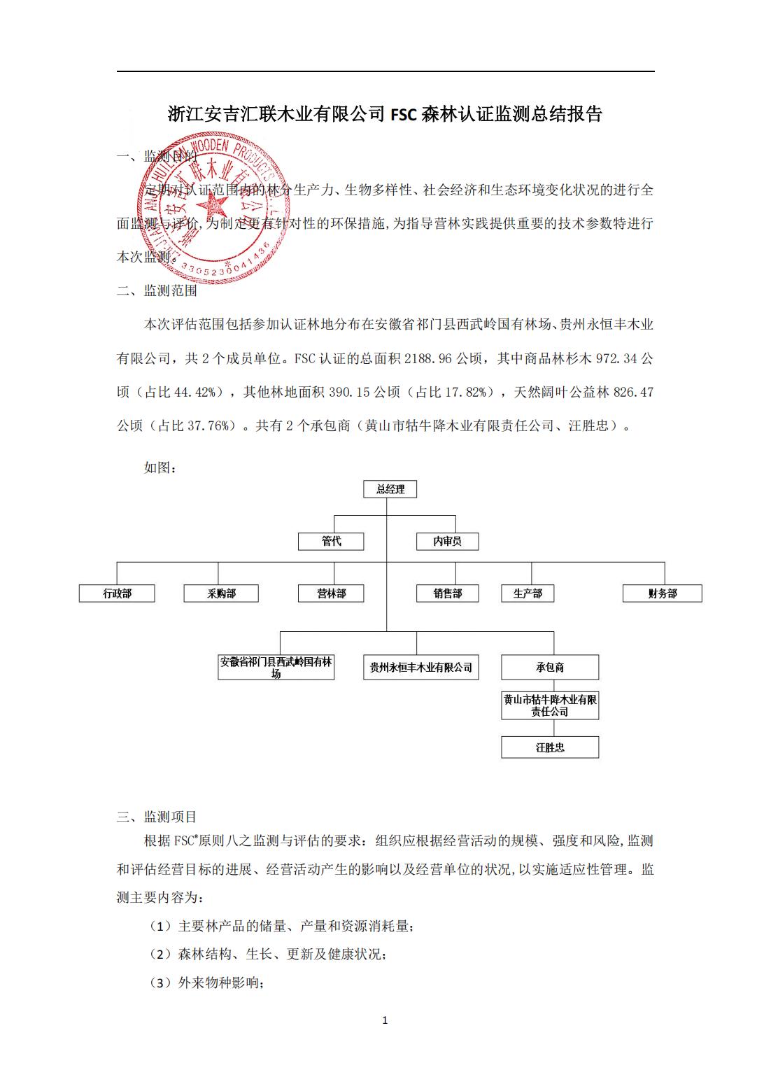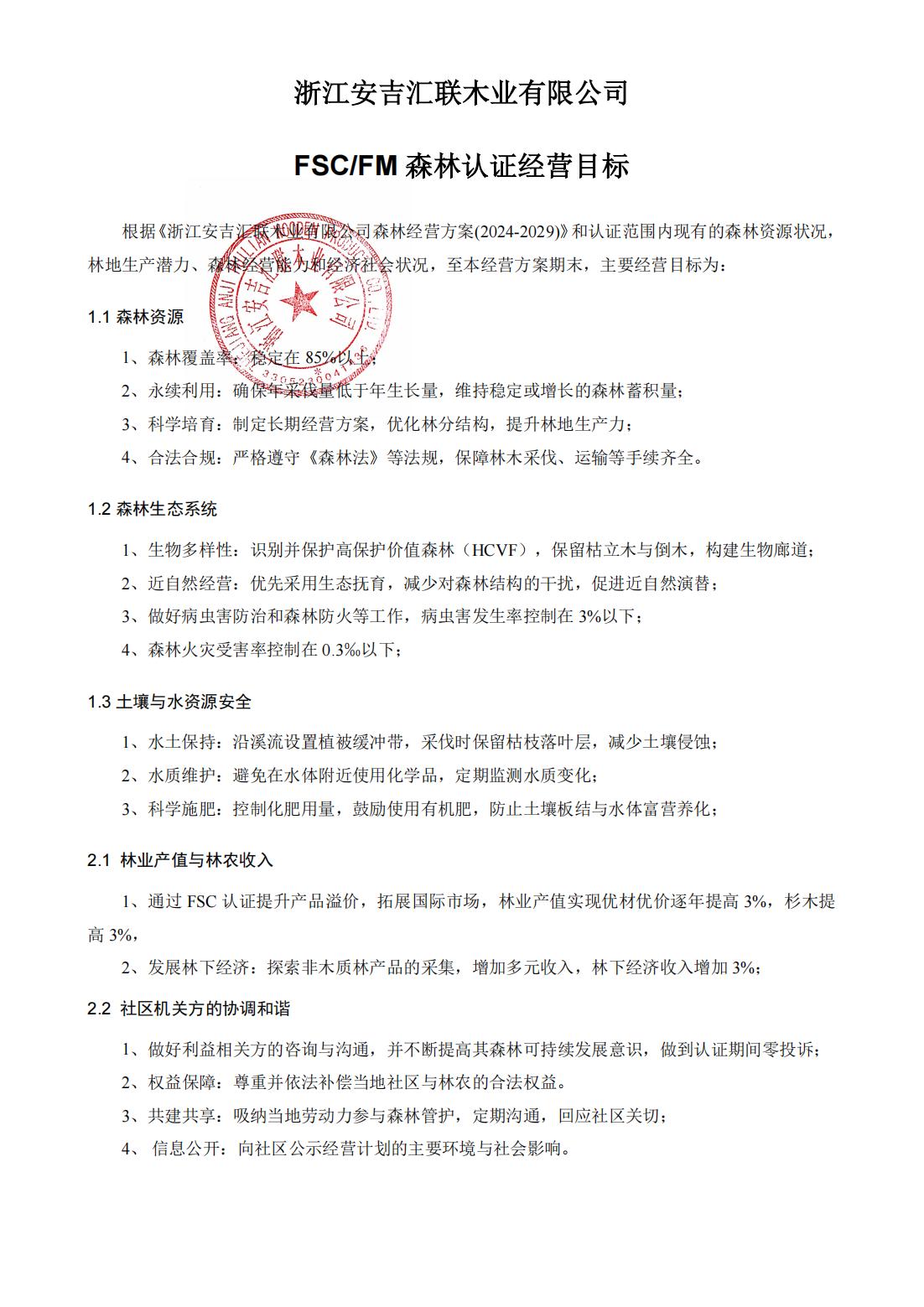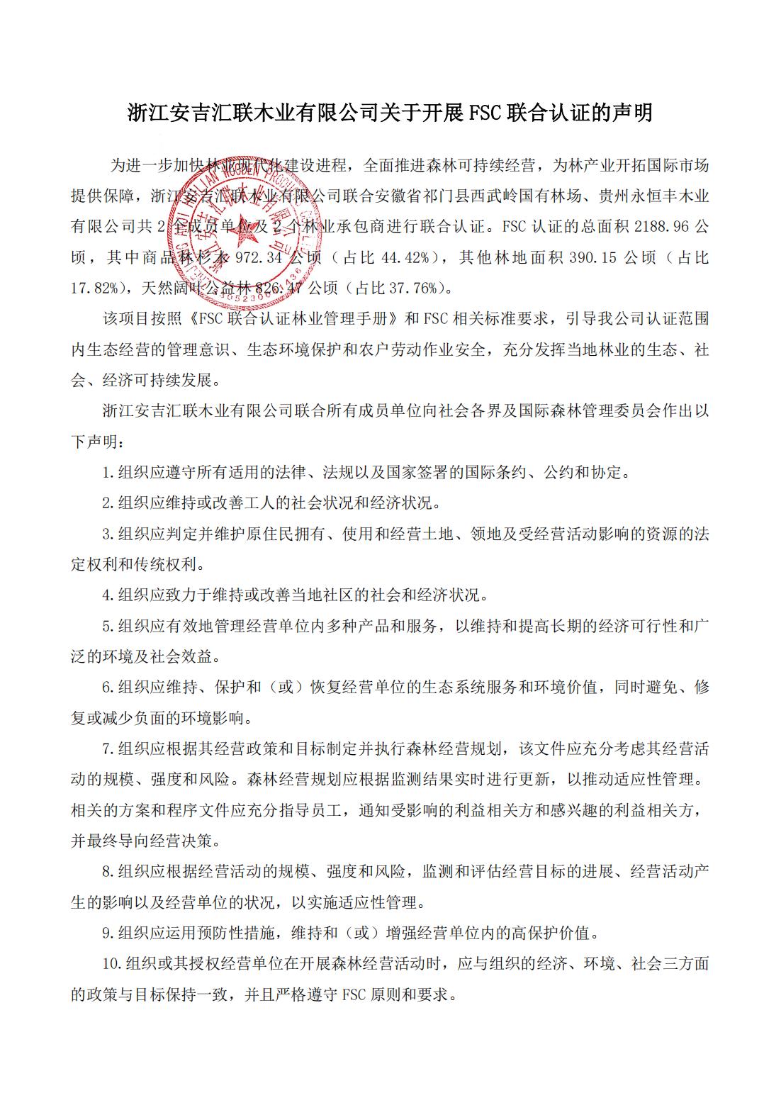 浙江安吉汇联木业有限公司拟通过FM森林认证进一步提高认证范围内的森林经营水平,提升森林的生态地位,实现森林的可持续经营,并旨在稳定和开拓国际市场、促进生态、经济和社会的可持续发展,现将本年度监测总结、认证范围、经营目标等内容公开,特此公示!